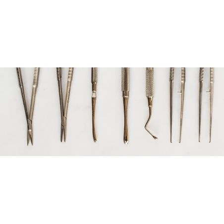 Toate instrumentele intr-o caseta autoclavabila, din inox, cu suporti din silicon pentru ca instrumentele sa stea fixe.